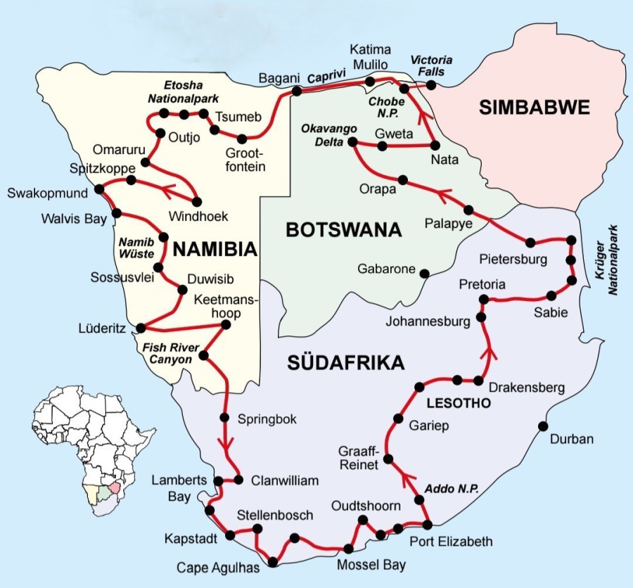 Schon lange träumen wir vom südlichen Afrika. Auf unserer Neuseeland-Tour berichteten einige Mitreisende bildhaft über die fantastische Landschaft und Tierwelt im südlichen Afrika. Davon waren wir richtig angefixt und buchten bereits im November 2024 diese Tour.