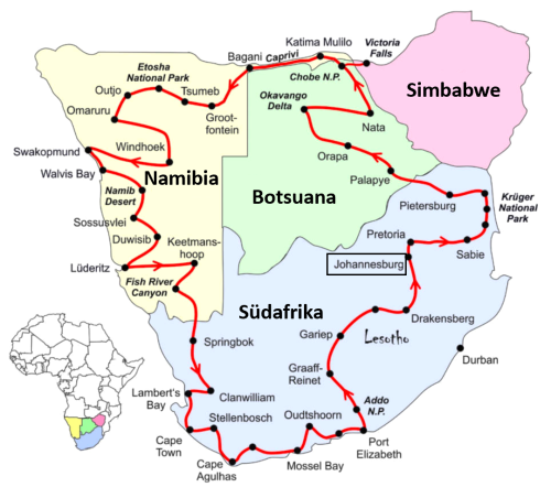 Unsere Tour beginnen wir Anfang Oktober im frühlingshaften Johannesburg, reisen entgegen dem Uhrzeiger durch insgesamt vier südafrikanische Länder und kehren von Johannesburg aus wieder zurück nach Deutschland. Dazwischen liegen genau zwei Monate und gut 11.000 Straßen-km, in denen wir das südliche Afrika erkunden.