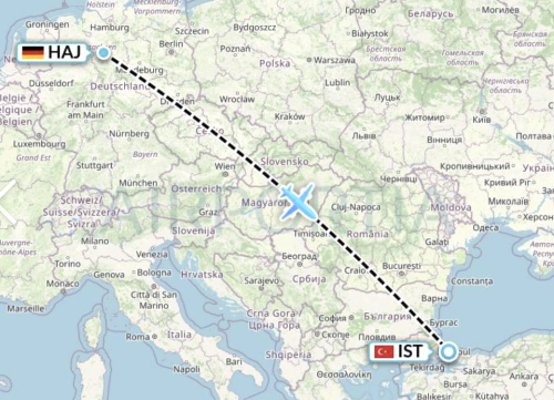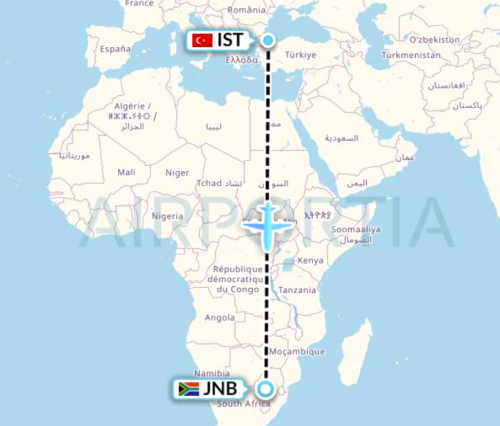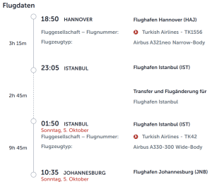 Von Hannover (D) über Istanbul (TR) nach Johannesburg (ZA).