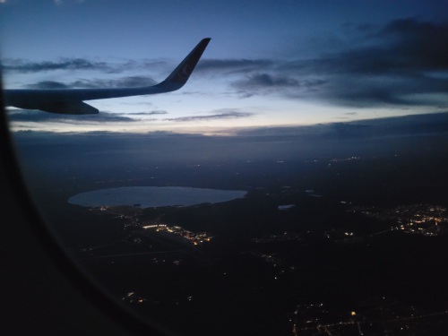 Nach Erreichen der Reiseflughöhe von gut 10.500 m bekommen wir über den Wolken bei einem anfangs leicht unruhigen Flug Hähnchen mit Reis und Tomatensauce serviert. Dazu Brötchen mit Butter und Remoulade. Als Nachspeise gab es einen Karamellpudding. Alles echt gut, auch der Rotwein schmeckte prima. Besser kann der Urlaub nicht beginnen.