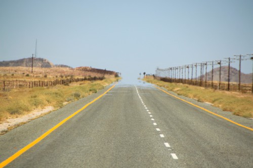 Die endlose Strecke heißt in Namibia B 1 und in Südafrika wird daraus die N 7. Bei der Hitze von fast 40°C scheint sich