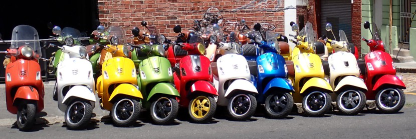 Die zum Verleih stehende Motorroller sind ebenso bunt wie die Häuser.