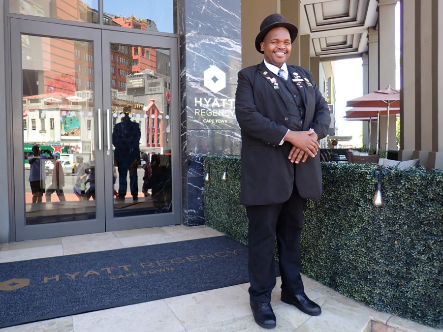 Beim Stadtrundgang kommen wir am Hyatt Hotel vorbei. Der Farbige Türsteher zeigt sich gerne in seiner korrekten Uniform.