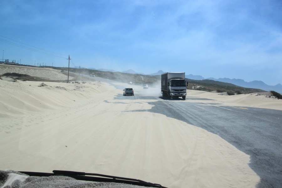 Auf den Küstenstraßen führt der feine weiße Sand bei Wind häufig zu Verwehungen.